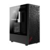 – Material: Chasis: Acero SPCC 0.45 mm, interior completamente negro. Panel frontal: ABS con tira de luz RGB sincronizable con los ventiladores. Panel lateral izquierdo: Vidrio templado